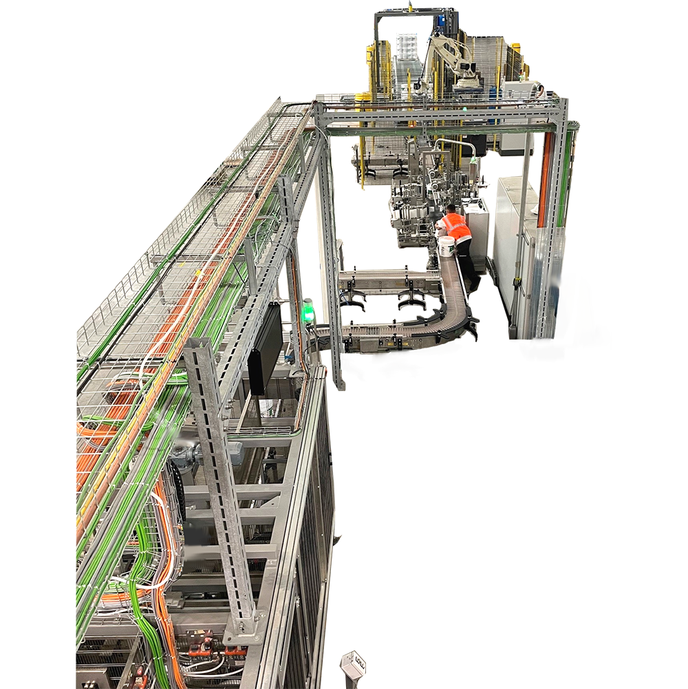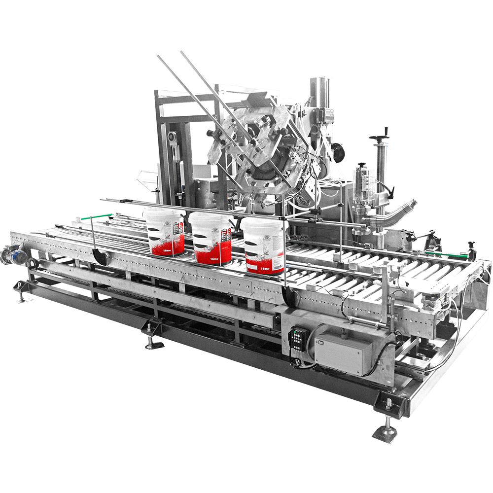 Gravimetric filling systems may be adopted for different format and dimensions of pails. The options may include automatic lidding system, automatic closing system for the lids and robot palletizer.